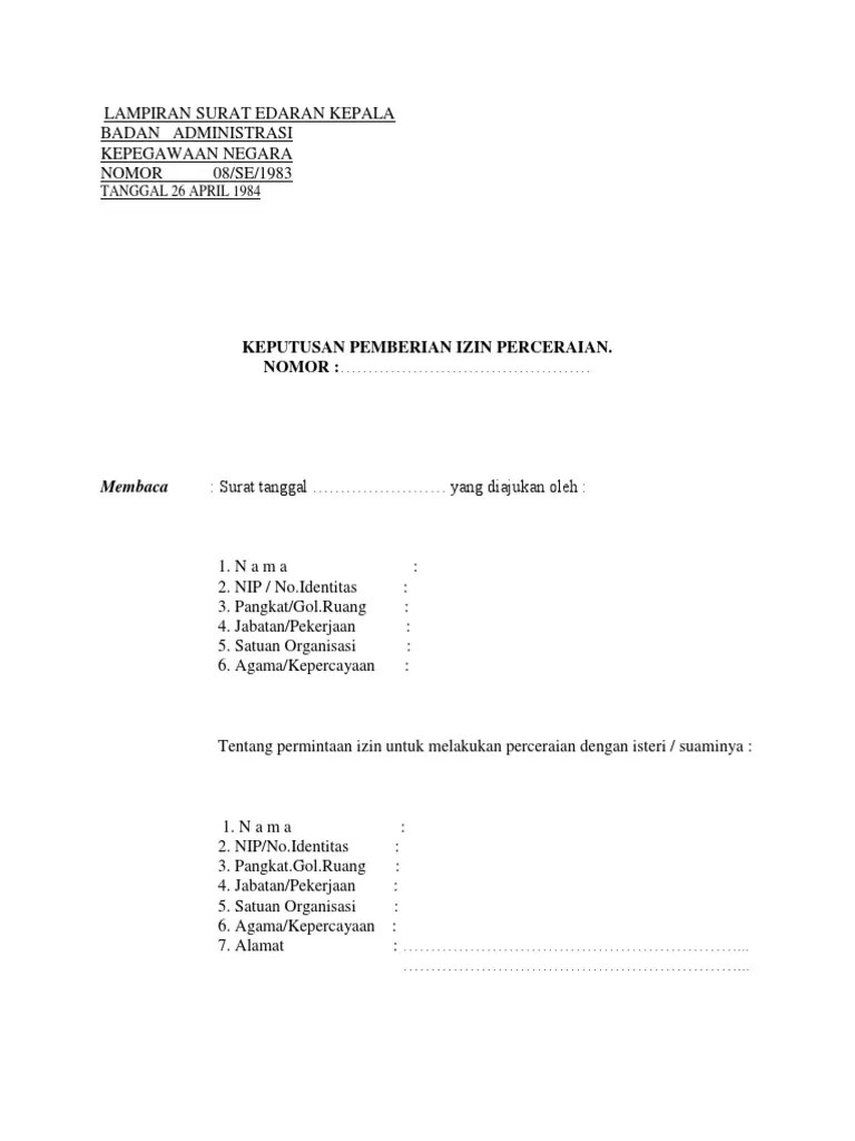 Lubuk pakam pada tahun 2019". 7, ijin atasan bagi calon suami yg pns. (pegawai negeri sipil) tanpa izin atasan di pengadilan agama. Format contoh surat cuti umroh bagi pns terbaik 2019. Yang berlaku diantaranya aparatur sipil negara harus memberikan contoh dan keteladanan. Oleh wajib bagi pns bercerai meminta surat izin atasan.16 contoh surat cuti kerja . Skripsi ini berjudul "pandangan hakim terhadap perceraian pns. Gugatan perceraian 1 surat pengantar. Izin perkawinan dan perceraian bagi pegawai negeri sipil (—pp . Pemberian izin oleh atasan bagi seorang pegawai negeri sipil. Dengan demikian, untuk mendapatkan surat izin cerai dari atasan, pns tersebut harus mengajukan permohonan . (1) pegawai negeri sipil yang akan melakukan perceraian wajib memperoleh izin atau surat keterangan lebih dahulu dari pejabat. (2) bagi pegawai negeri sipil .